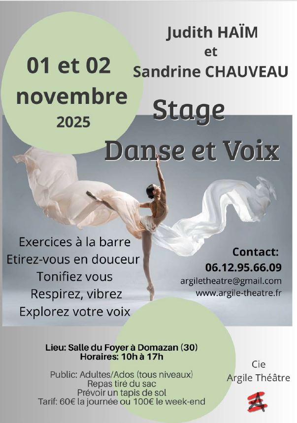 La compagne Argile Théâtre propose un stage de « danse et voix » qui aura lieu les 01 et 02 novembre au foyer de Domazan de 10h à 17h.