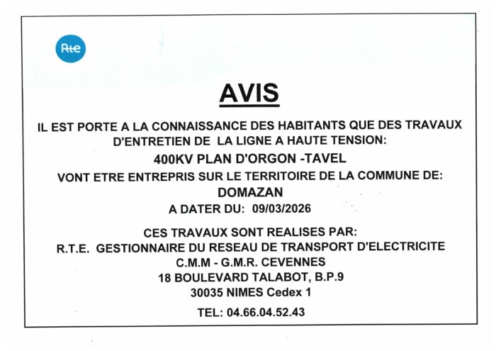 https://domazan.fr/actualites/avis-rte-a-compter-du-09-03-2026-des-travaux-dentretien-sont-prevus-sur-la-ligne-a-haute-tension-400kv/