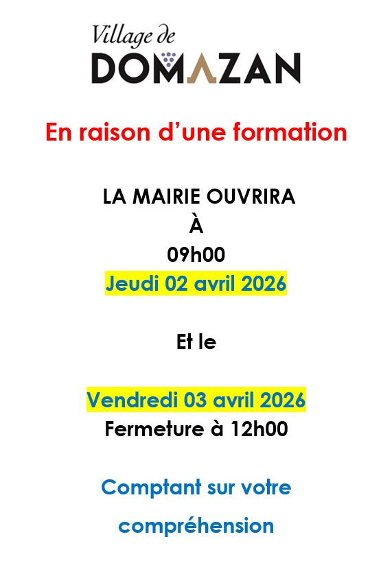 https://domazan.fr/actualites/modification-horaires-mairie-jeudi-02-et-vendredi-03-avril-2026-en-raison-dune-formation/
